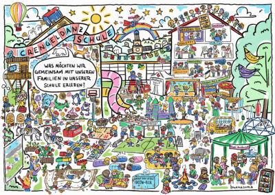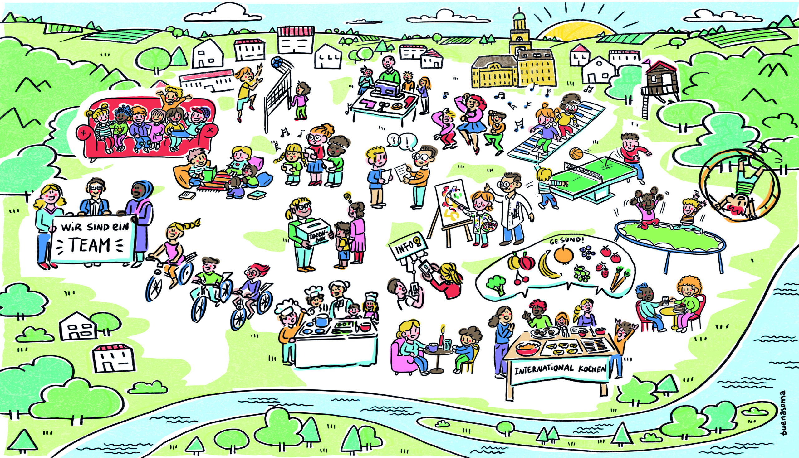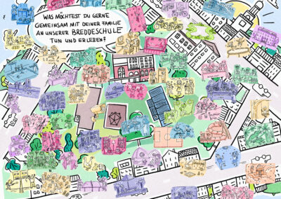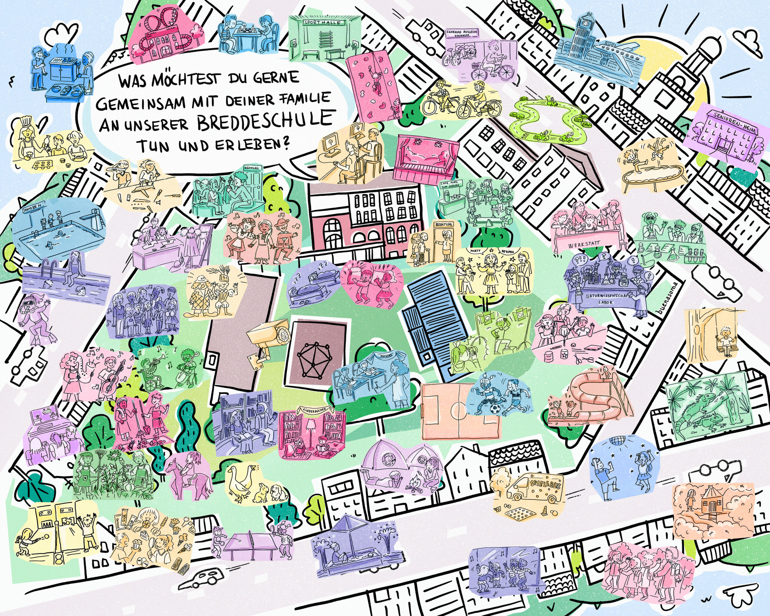 Auf der Ebene der Schulen fanden zunächst partizipative Beteiligungsprozesse mit Kindern, Eltern und dem Kollegium statt. Durch Mitmachdesign-Workshops entstand ein gemeinsames Leitbild, das das Zugehörigkeitsgefühl stärkt und die Familien aktiv in die Gestaltung der Schulen einbezieht. Durch diesen intensiven und partizipativen Prozessanfang an den Schulen wird das Ziel einer nachhaltigen und erfolgreichen Etablierung der FGZ verfolgt.